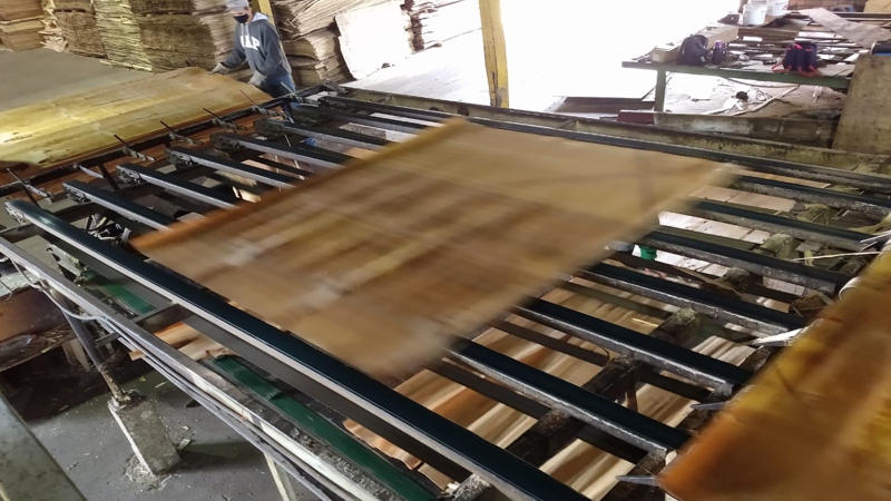 As lâminas oriundas dos tornos são levadas ao secador de lâminas onde passam por um processo de secagem onde cada espessura tem seu tempo de processo. No estágio final de secagem a umidade é conferida e assim empacotadas e levadas ao estoque.